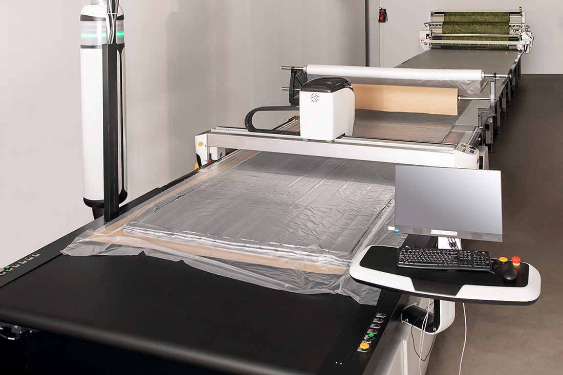 Чтобы обеспечить высокий темп работы раскройного комплекса, мы дооснастили его автоматической настилочной машиной и многосекционным настилочным столом с поддувом. Данное решение обеспечивает высокую скорость и качество настила из любых типов материалов с последующим перемещением его в зону непосредственно раскроя.